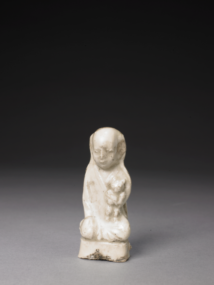 白釉瓷抱猫童子坐像